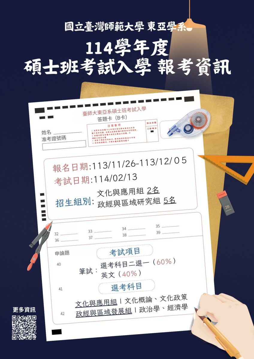 .考試日期:筆試時間114年2月13日(星期四),術科及口試時間依簡章各系所之規定